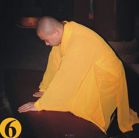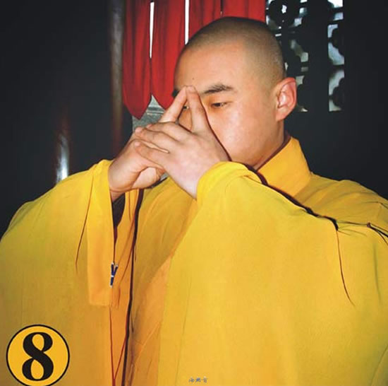 第七.左掌离蒲团,置于胸前如合掌之状;右掌用力撑起(两膝同时离蒲团),合于左掌当胸,此为一拜。