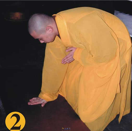 第二.分右掌向下,按于蒲团之中心,左掌不动,两膝跨开,跪于蒲团上。