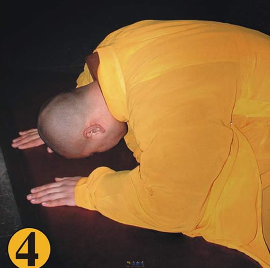 第四.右掌从中心移于蒲团之前右边,两掌相离六寸许;以头按于两掌中间之蒲团上;